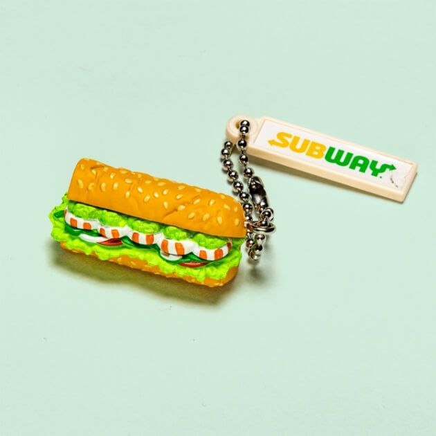 サブウェイの商品をモチーフにしたフィギュア。えびアボカド、てり焼きチキン、アイスコーヒー、コロコロポテト、スープ、トレーの全6種類があります。