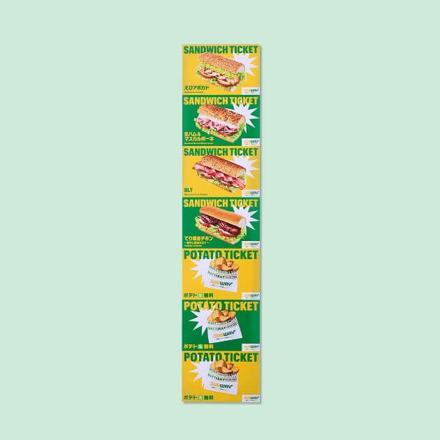 サンドイッチ(えびアボカド、BLT、生ハムマスカルポーネ、てり焼きチキン)各1枚、ポテトSサイズ3枚で3,080円相当分が入っています。全国のサブウェイ店舗(スキー場、球場店舗は除く)で2025年3月31日まで使えます。
