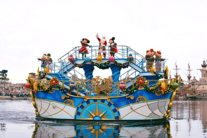クリスマスのオーナメントで彩られた船に乗って登場するのはミッキー&ミニー、ドナルド&デイジー、ダッフィー&シェリーメイという豪華なディズニーの仲間たち。そして中央にはサンタクロースの姿も!赤と緑を基調としたコスチュームがとってもかわいらしいです♡
