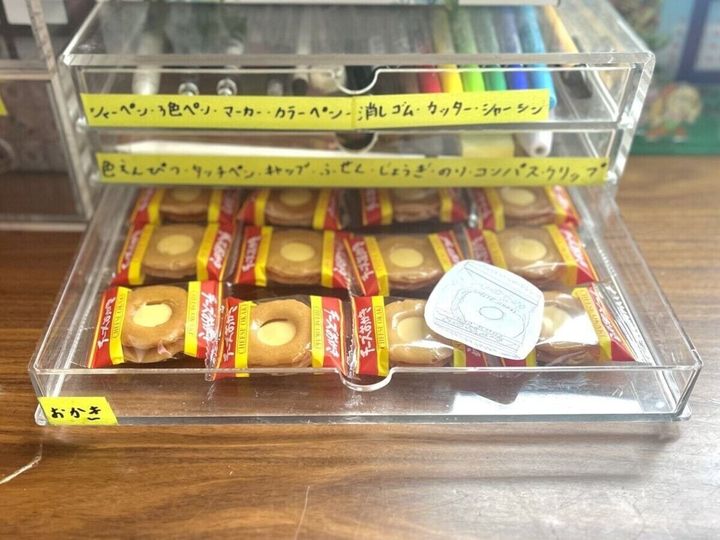 整理が好きだという息子さんは引き出しにラベリングをして、文房具をわかりやすくきれいに収納しています。注目したいのは一番下の段。「おかき」と書かれたその段にはチーズおかきが入っています。