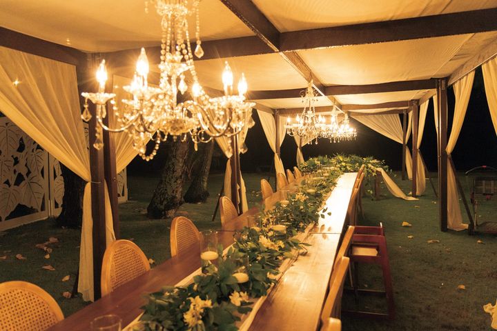 花:ふたりともリゾートというより、クラシックでヨーロッパのような雰囲気に仕上げたいと思っていたので、テーブル装花もエキゾチックな花々ではなくグリーン系にしました。ラグジュアリーなシャンデリアは夫のこだわりです。