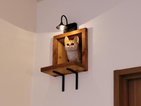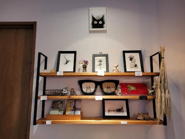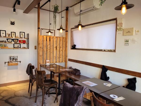 お店の入口には、店名の通り猫のイラストのついた暖簾が掛けられています。こちらは店主さんの手描きで、愛猫の黒猫ちゃんがモデルなのだとか。レトロな外観はとても可愛らしく、目を惹きます。オープン時に手づくりされたという内装も、温かみがあり落ち着く空間です。店内には猫ちゃんやわんちゃんの置物がたくさん。探すのも楽しいです。
