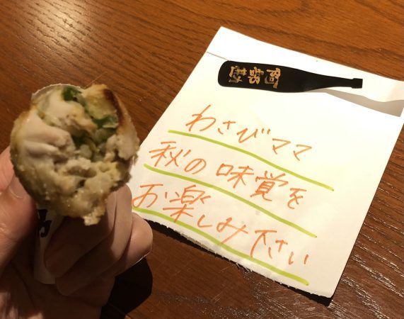 袋に入った、揚げた鶏のメニュー。鶏の皮の中には、もち米、南蛮味噌、茹でた生らっかせいが入っていました。
