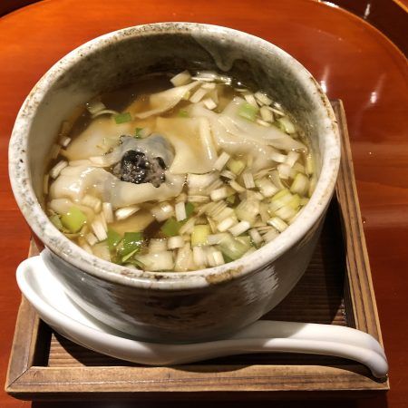 少し濃いめのお出汁。海苔の入ったワンタン3つ、おネギがたっぷり入っています。飲んだ後にはたまりませんね。
