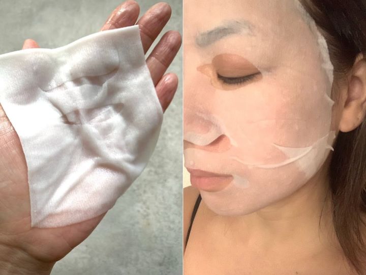 左:7枚入りのパッケージには1袋でなんと113mLものローションが。このうるうる感伝わりますかね~。右:面長で奥行き深めの顔にもぴったりフィット。頬の下に切れ込みもあるので、丸みのある頬やエラのラインにも密着。10分間、剥がれ落ちることもありません。