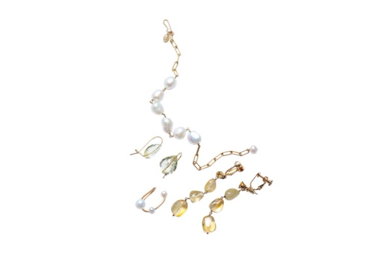 【上から時計回りに】パールブレスレット[K14GF×淡水パール]¥11,000、シトリンイヤリング[K14GF×シトリン×ルチルクォーツ]¥11,000、パールイヤカフ[K14GF×淡水パール]¥9,900、レモンクォーツピアス[K14GF×レモンクオーツ]¥13,200/以上ナチュラリ ジュエリ(NATURALI JEWELRY 新宿髙島屋店)