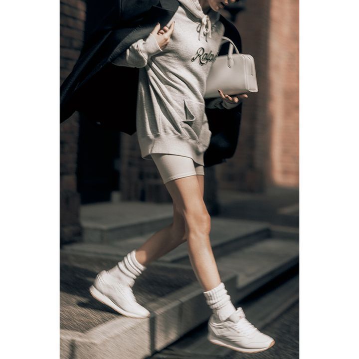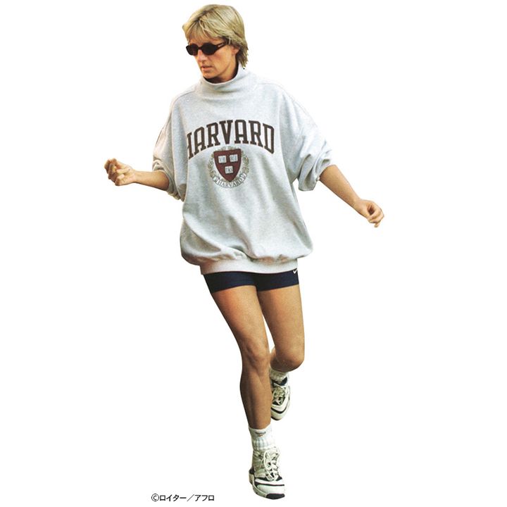 ロゴスウェットにバイカーショーツ、足元は白ソックスに白リーボック、はスポーティな日の定番。一大ブームとなった「アスレジャー」を一つのスタイルにしたのはダイアナ妃という説も。ジャケットをラフに羽織ってきちんと感プラス、都会派スポーティを満喫するのもいい!