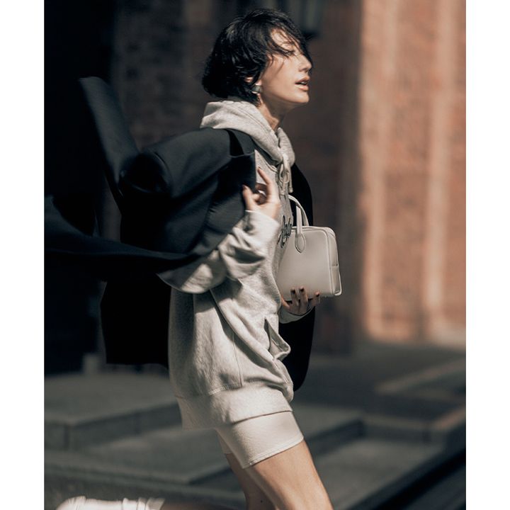 ジャケット¥242,000(ジア スタジオ/ザ・ウォールショールーム)フーディ※メンズ¥33,000(ポロ ラルフ ローレン/ラルフ ローレン)バイカーショーツ¥17,600ソックス¥3,850(ともにSEA/エスストア)ピアス¥48,400(アサミフジカワ/ショールーム セッション)バッグ¥38,900(トゥティエ)スニーカー¥11,000(リーボック)