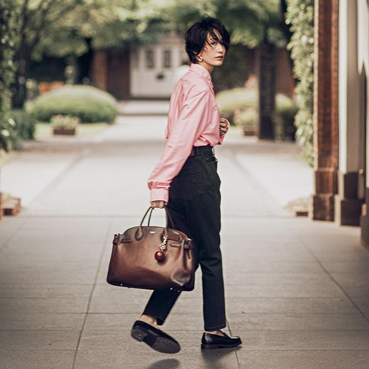 デニムにボタンダウンシャツ、王道ベーシックのワンツーを品よく洒落て見せるには、デニムの目利きと小物が肝。ハイウエストのテーパードデニムにクラシックなローファーとおっきめボストン。“コンサバ”を程よく効かせるのがコツ!