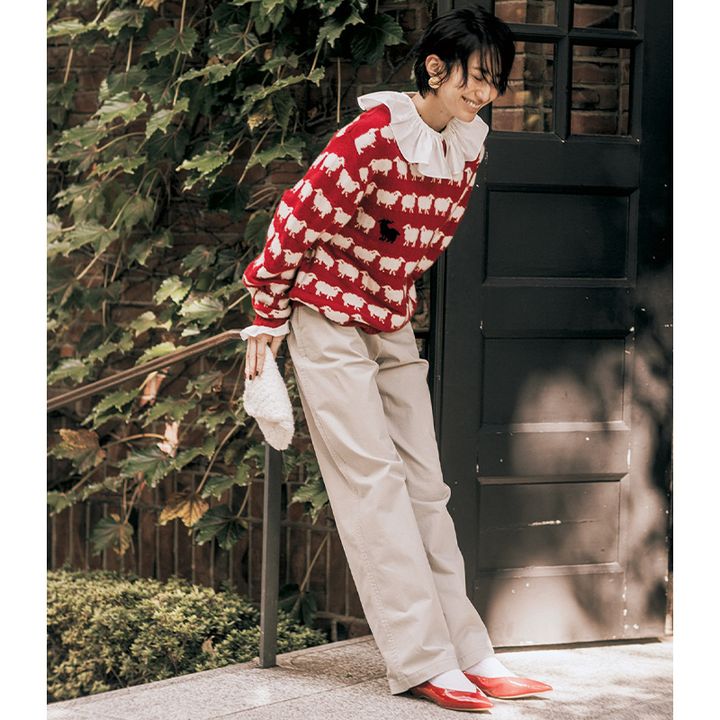 白い羊の群れの中に黒い羊が1頭いる、樋口さんも「写真で見て印象的だった」という“ダイアナ”ニットが、オマージュされた形で今季ロンハーマンより発売。甘ブラウスを重ねて、足元は赤のポインテッド。大人の甘さと遊びが効いたスタイリングがキュート!