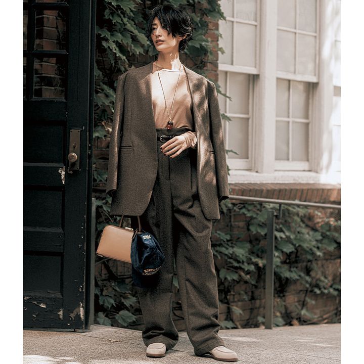 ともすると気合いが入りすぎて見える、定番のジャケット×パンツは抜け感のあるカットソーを挟んでラフさをプラス。かっちりバッグにキャップをつけたり、“遊び”を入れて、肩の力が抜けたスタイルに。