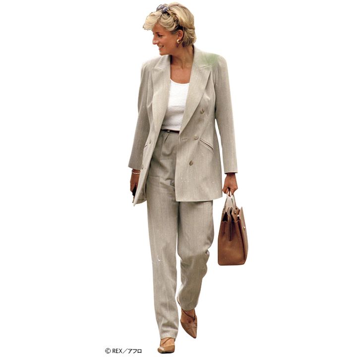 肌がきれいに見える、気品あるニュートラルカラーもダイアナ妃ファッションの要。くすみワントーンのセットアップは、すぐに真似できるテクニック!