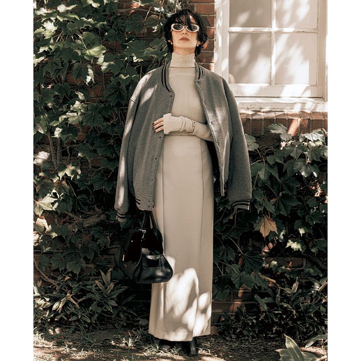 スタジャン¥24,900(Gap)タートルニット¥37,400スカート¥47,300(ともにオーラリー)サングラス¥49,500〈DMY ストゥディオス〉バッグ¥195,800〈ハルノブムラタ〉(ともにザ・ウォール ショールーム)ピアス※3つセット¥15,000バングル¥9,990(ともにバナナ・リパブリック)バッグにつけたチャーム¥4,000(トゥ)ロングブーツ¥72,600(デ・プレ)