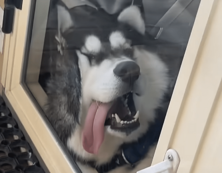 変顔になってるよー! ドアに張り付いちゃってる犬さん。