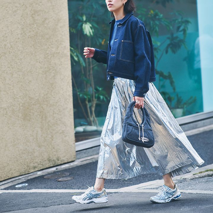 デニムジャケット¥39,600(トラディショナルウェザーウェア/トラディショナル ウェザーウェア ルミネ有楽町店)ニット¥34,100(オーラリー フォー ロンハーマン/ロンハーマン)フレアスカート¥16,940(アダム エ ロぺ)ピアス¥24,200リング¥35,200(ともにブランイリス/ブランイリス トーキョー)バッグ¥26,400(SEA/エスストア)スニーカー¥19,800(アシックス/アシックスジャパン カスタマーサポート部)