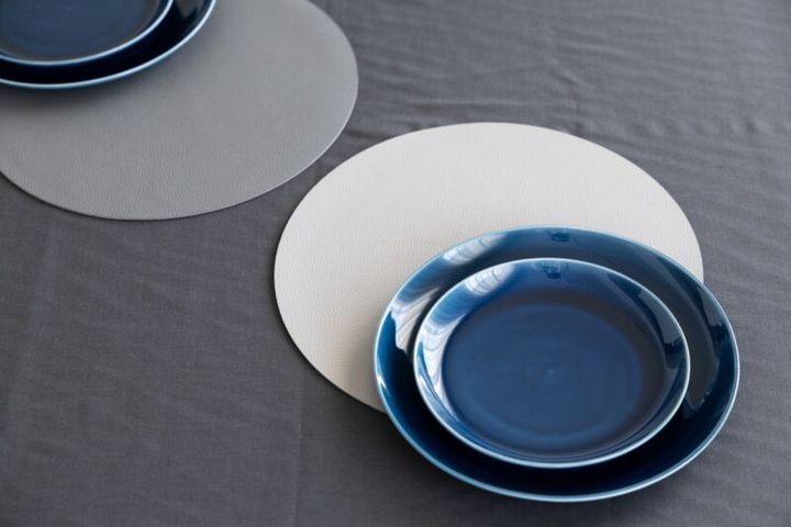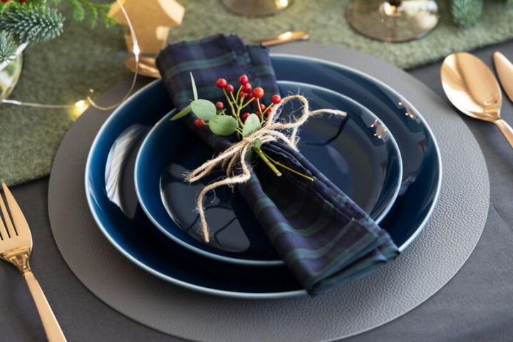 サイズちがいのマットやプレートを重ねてセットすると、レストランのような特別感が出ます。使った順にプレートをさげれば、給仕もスムーズ。クリスマスといえば「赤×緑」が定番ですが、あえて「紺×緑」のシックな色合わせで大人っぽい雰囲気に。シルバーのカトラリーだとちょっと寂しい感じがするので、ゴールドのカトラリーで華やかさと温かみを加えました。