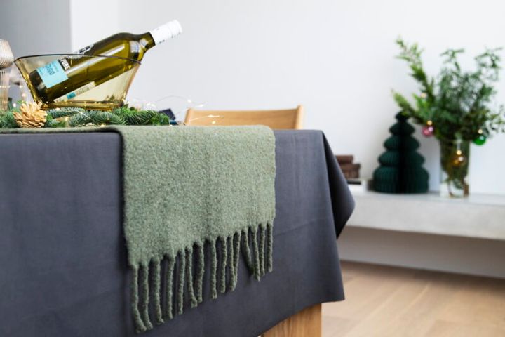 テーブルの中央に敷くテーブルランナーも、テーブルを華やかに演出する名脇役。とはいえ、ふだん使わないものをわざわざ買うのももったいない……。そこで、テーブルランナー代わりにマフラーを使いました。アイロンをかけたマフラーやストールをテーブルの中央に敷くだけでOK。シフォンの生地やストールをフワッと敷くのも素敵です。