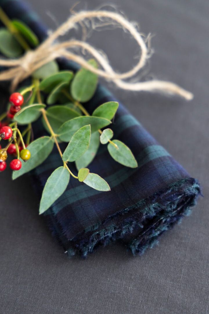 「紺×緑」のブロックチェックの布をクロスにアレンジ。切りっぱなしのままでも、布の端から出る糸だけをきれいにカットすれば問題なし。ミシンなどで裾の処理をしなくても時短でできます。野ばらの実とユーカリを添え、麻紐で結んで大人かわいく。