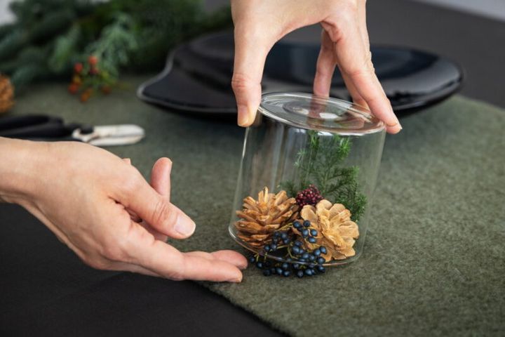 “即席足つき器”の足として使ったガラスポットは、オーナメントを飾るのにも使えます。100円均一の松ぼっくりなどの上からガラスポットをかぶせるとまとまりよく、おしゃれ感がアップします。