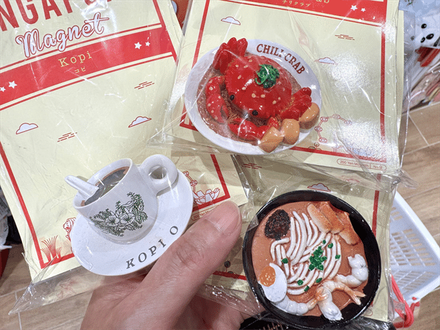 品数は多くなく、シンガポールチキンライスの素やお菓子、マーライオンのぬいぐるみキーホルダーなどがラインナップ。一緒に並んでいたのが、シンガポールのグルメをモチーフとしたマグネットです。