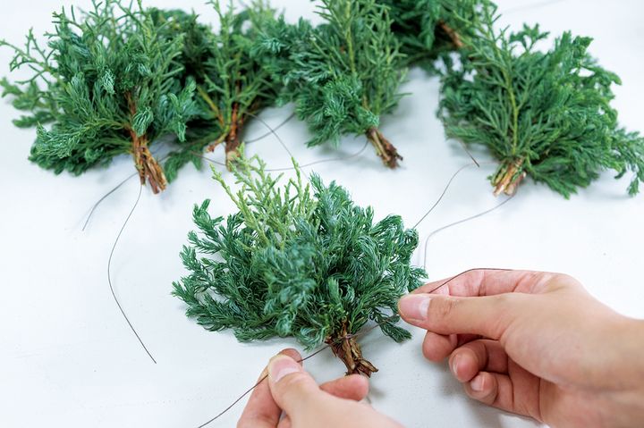 (3)土台の2/3(範囲は好みでよい)に(2)を飾りつける。開いたワイヤで土台を抱き込むようにして、裏側でねじって留める。2つ目以降は前の束の根元が隠れるようにして留める。