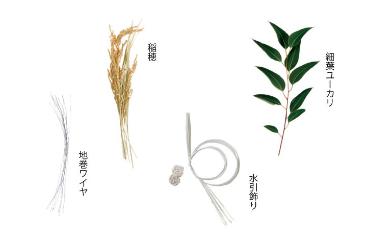 (4)稲穂とユーカリのワイヤを巻いたところにワイヤや両面テープで水引を飾る。シールタイプの水引を貼っても。
