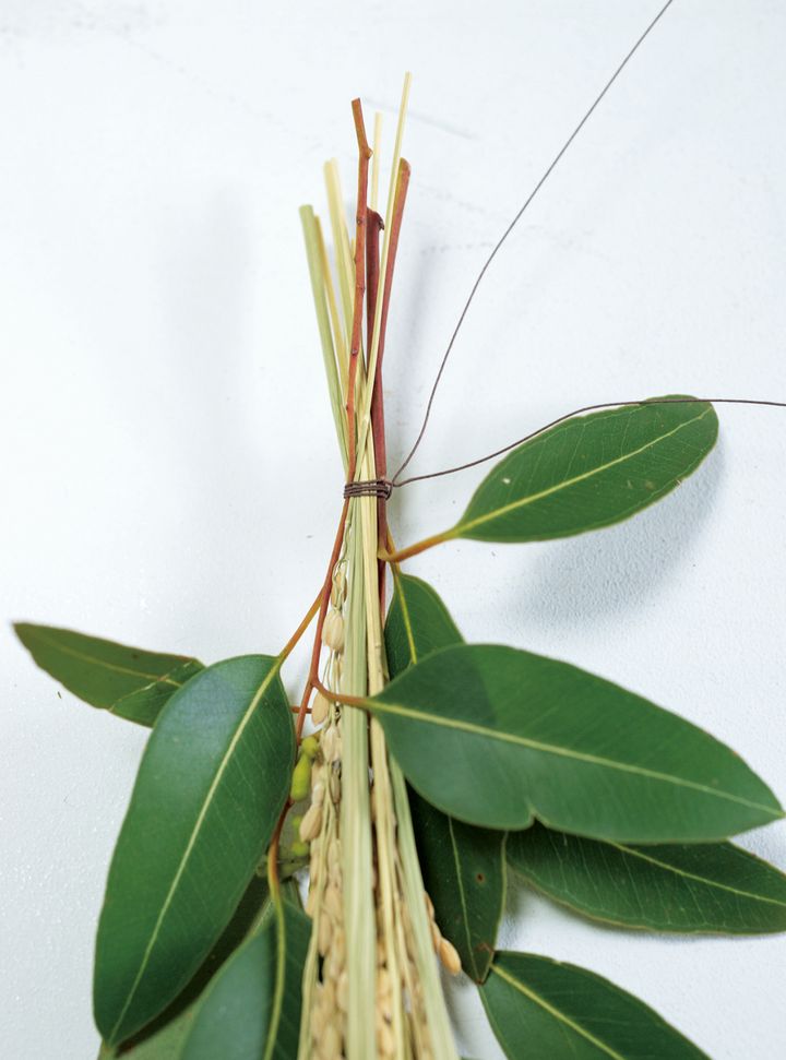 (2)稲穂と細葉ユーカリにワイヤを巻きつけて束にする。長さの目安は35㎝、それより長い場合には茎を切って長さを整える。ワイヤの先は開いておく。