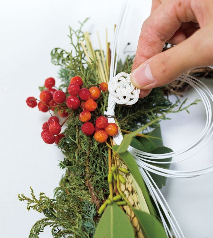 細葉ユーカリと稲穂を縦に飾ることでIラインを強調して、印象を一新。水引飾りをアクセントにしてクリスマスとは異なる表情を引き出します。