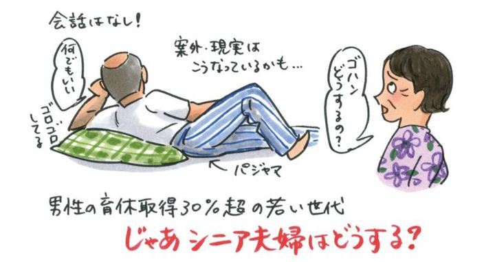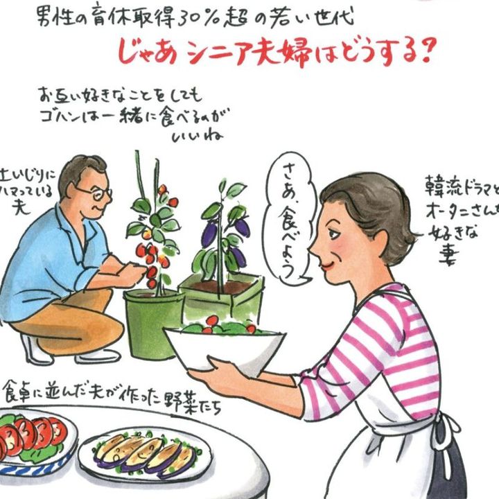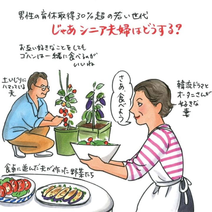 さて、若い人たちが家庭のことに協力的なのは喜ばしいことだが、われらシニア夫婦はどうなのか。よく聞く話は、定年退職した夫の居場所が家にはないだの、時間を持て余している夫がなにをしていいのかわからない、というやつ。妻と食べ歩きや旅行をしたらいいんじゃない?と思うが、妻の方は夫と一緒ではつまらないから、女友達と行く方がいいという。つまり、現役時代の夫が家のことを奥さんに任せきりにしたツケが出たわけだ。