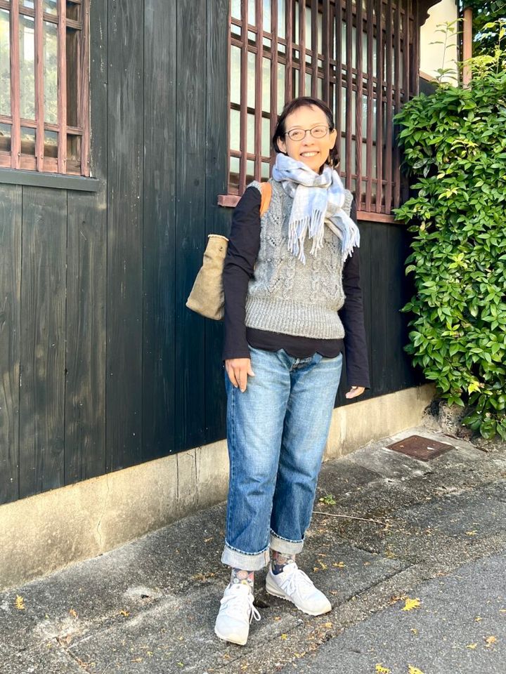きれい色のストールで目線を上に集めつつ、ニットベストとロールアップしたデニムで軽やかな印象に仕上げた、冬の始まりにぴったりなコーディネート。「もう何年も前に挑戦して、ずっと着続けているハンドメイドのニットベストは、三國万里子さんのキットで作りました」という恭子さん。一つひとつのアイテムはシンプルでボーイッシュなのに、細部に大人の愛らしさがにじみ出る、グッドセンスな着こなしです。
