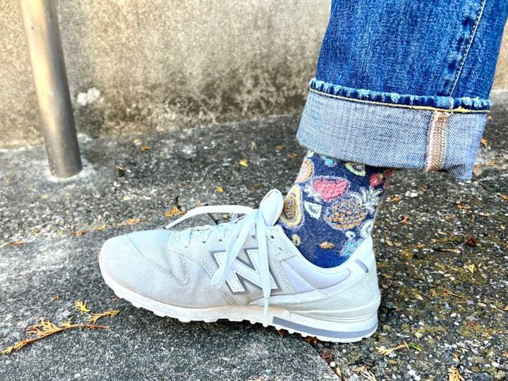 「気に入って履きすぎているから、お恥ずかしい」と言いながら見せてくださった靴下は、京都・下鴨神社のフリーマーケットで購入した「kの世界」の作品。「カラフルでおとぼけなデザインの靴下の、どこかにほんのちょっとだけ手刺繍が入ってるんですよ」