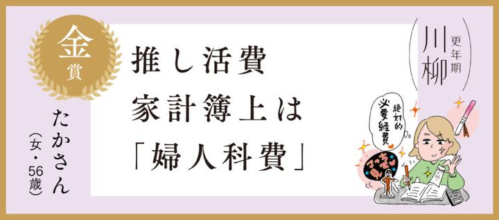 「推し活が更年期のメンタルを救っているのでしょうか。堂々と「婦人科費」と書き、ユーモアで吹き飛ばしてくださった一句。」