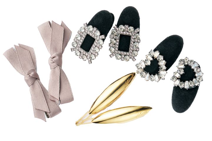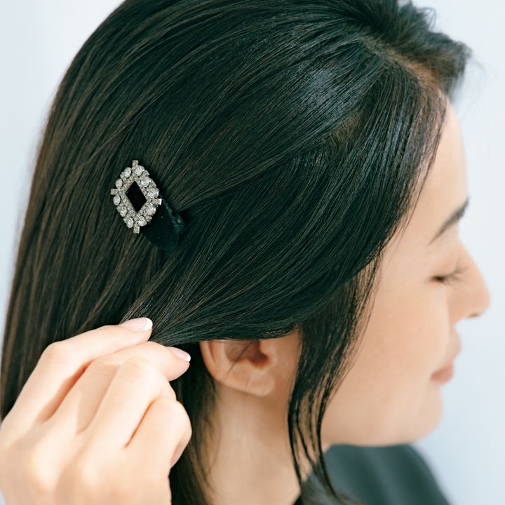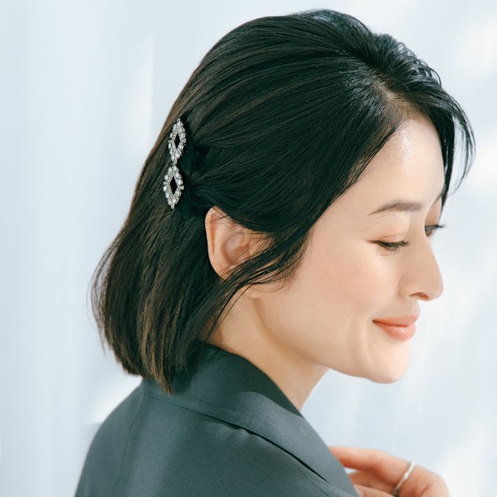 左からリボンミニクリップ[2個セット]¥880(アネモネ/サンポークリエイト)ビジューミニクリップ 各¥2,860(DECOLLTE ACCESSORY) ※モデル着用分[2個セット]¥5,280 ゴールドピン 各¥9,900(レチシア)