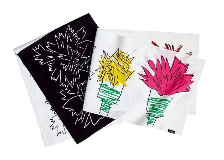 〈マリメッコ〉でテキスタイルデザイナーを務めた石本藤雄が、故郷の愛媛・松山から発信する〈ムスタキビ〉。人気の手ぬぐいに、カーネーション柄の2枚が仲間入り。左は、1994年に制作した絵皿のドローイングをモノクロで表現した「なかよし」、右は、力強いタッチで描いた「カーネーション」。壁に掛けるなど、インテリアとしても活用したい。