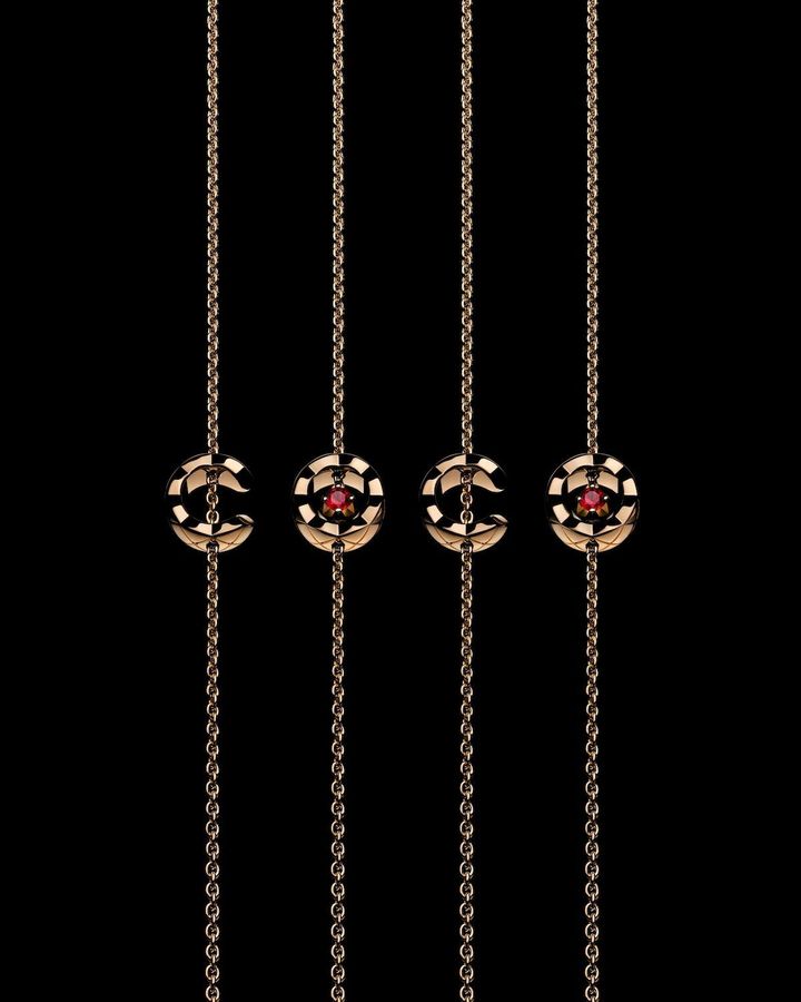 ネックレスは、ブランドイニシャルである“C”モチーフに0.18カラットのルビーが寄り沿うデザインでお目見え。一方、しなやかなチェーンブレスレットは、キルティングモチーフを刻んだサークルの中央にルビーをセット。チェーンの長さは、その日のスタイルに合わせてネックレスは5段階に、ブレスレットは3段階に調整することができる。