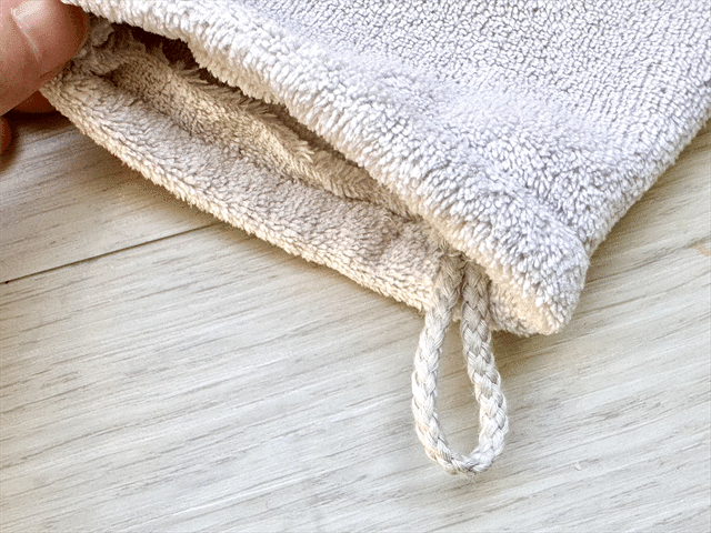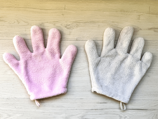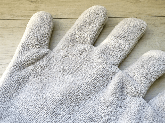 速乾!ヘアドライ手袋は、ふわふわと柔らかい手触りなのですが、洗濯を重ねて少しゴワついてきたな、と感じたら取り替えています。100円なので、気軽に買い替えられるのもいいところ。