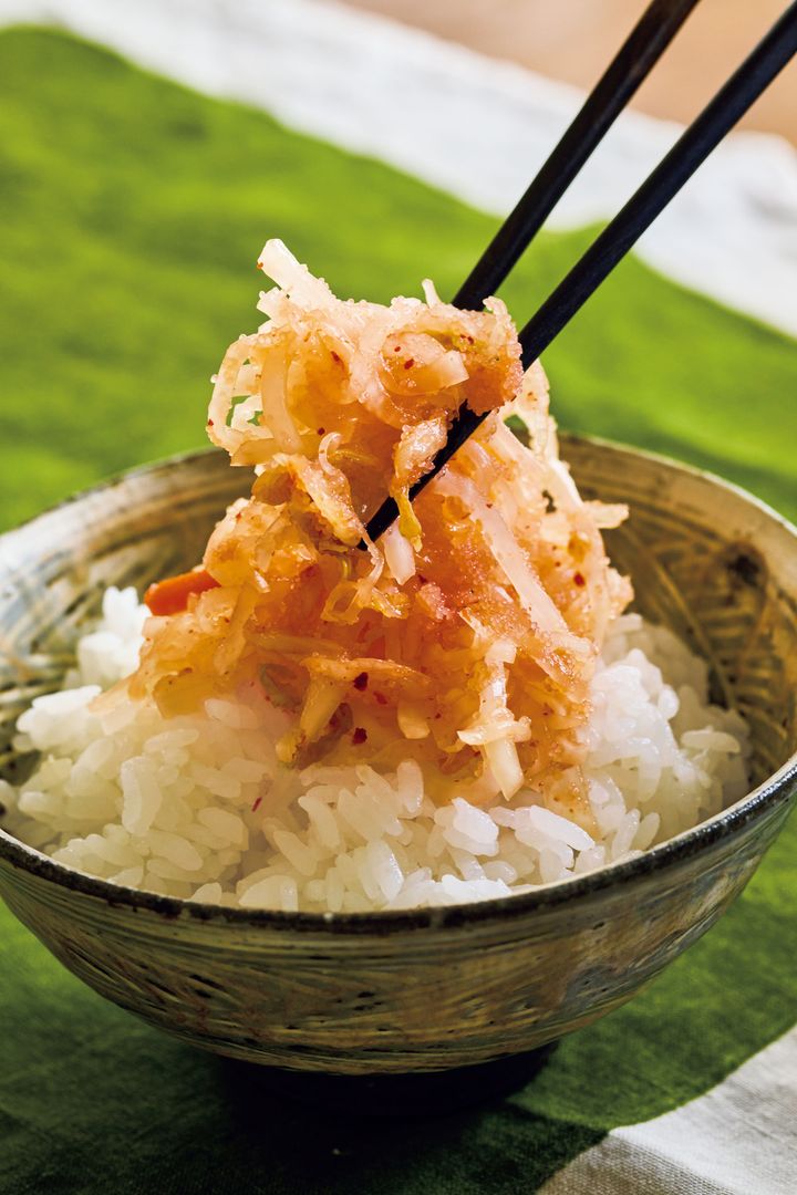 大根とキムチ、うまみ抜群な明太子のたった3つをあえるだけで、白いご飯がみるみるなくなる〈ご飯の友〉に変身します。