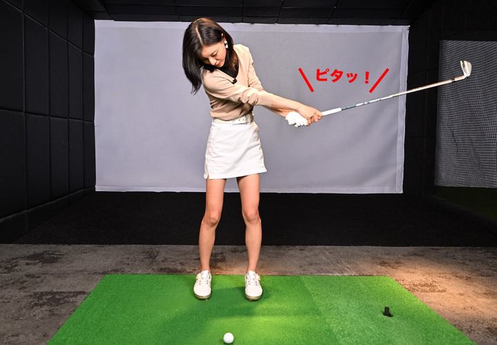 特に、クラブを力なく振る人は要注意です。小さなスイングでも力強い球を打つのが、この練習の大きなテーマです。ビシッとボールを強く打つイメージでクラブを下ろしましょう
