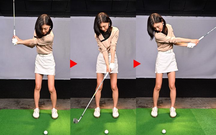 右ヒジを曲げてバックスイング。右腰の高さぐらいに両手を上げるが、両ヒザは正面に向けること(左が内側に入りやすいので、とくに注意!)。次に、左ヒジを曲げてフォロー。両手は左腰の高さぐらい。