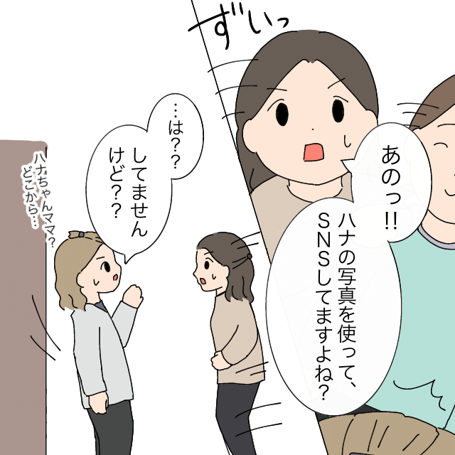 スミレちゃんママがドアを開けたタイミングですかさずハナちゃんママが登場し、「ハナの写真を使ってSNSしてますよね?」と単刀直入に聞きました。すると「は?してませんけど?」と焦りながらも否定するスミレちゃんママです。