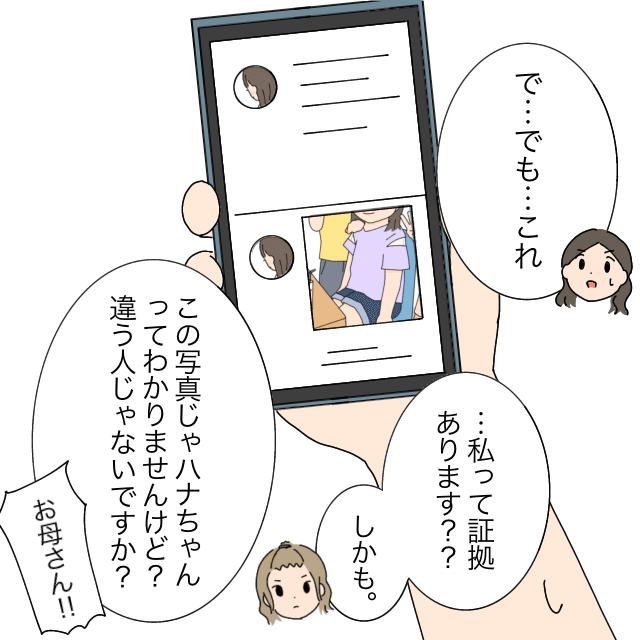ハナちゃんママはそれでも問題のアカウントをスミレちゃんママに見せましたが、「私って証拠あります?しかもこの写真じゃハナちゃんってわかりませんけど?違う人じゃないですか?」ととぼけられてしまいました。確かに顔はハッキリと映らないように切り取って使われていますが、本人や親、それにお友達にはハッキリとハナちゃんだとわかる写真ばかりです。そこへ「お母さん!!」と割って入ってきたのはスミレちゃんです。