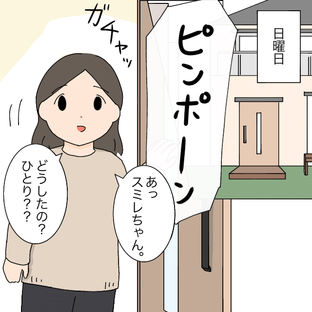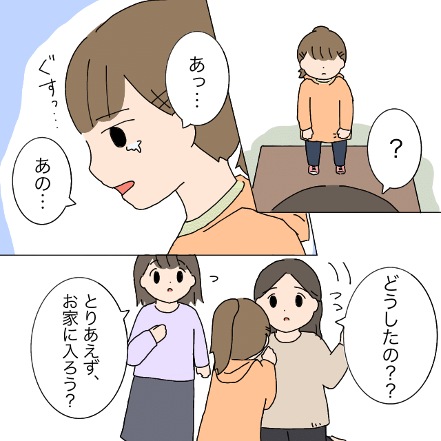 ドアを開けるなり耐えきれずに泣き出したスミレちゃんを見てハナちゃんもハナちゃんママもビックリです。「どうしたの?」「とりあえず、お家に入ろう?」