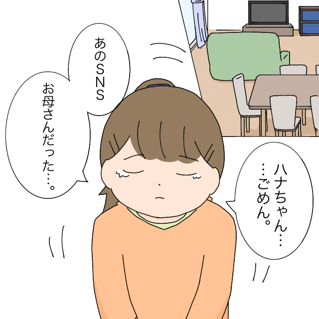 スミレちゃんは泣きながらうつむいて「ハナちゃん・・・ごめん。あのSNSお母さんだった。」と驚きの事実を告白しました。