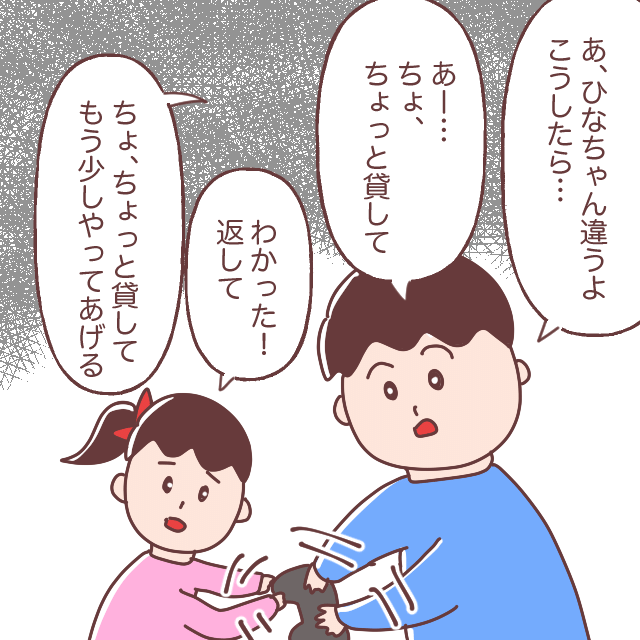 ひなちゃんは「わかった!返して」とパパさんに言いますが「ちょ、ちょっと貸しても少しやってあげる」とまたもや奪おうとしました。