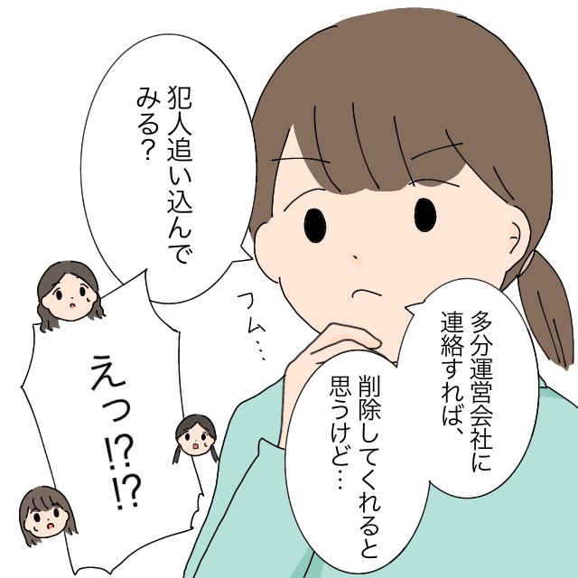 するとアキちゃんママが「多分運営会社に連絡すれば、削除してくれると思うけど・・・犯人追い込んでみる?」と言い3人は驚きます。