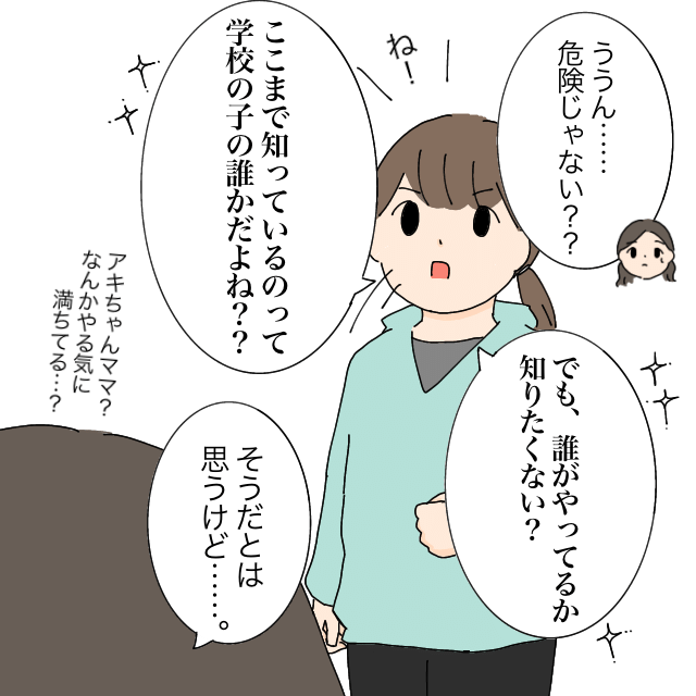 ハナちゃんママは「ううん・・・危険じゃない?」と言うと「でも、誰がやってるか知りたくない?ここまで知ってるのって学校の誰かだよね?」とやる気に満ち溢れたアキちゃんママでした。