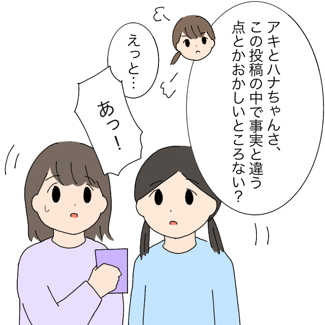 「アキとハナちゃんさ、この投稿の中で事実と違う点とかおかしいところない?」とアキちゃんママが2人に聞くと「あっ!」とアキちゃんが何かに気づきました。