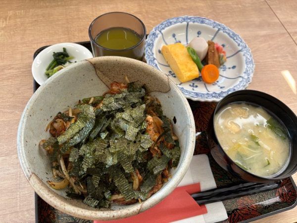 今回いただくのは「海苔豚丼」です。今日の日替わり「TAKARA御膳」1200円は、黒豚のメンチカツとコーンクリームコロッケだったのですが、ガッツリお肉が食べたいなと思い、こちらを選びました。他にも、「ひまつり膳」1600円(そば、天ぷら、刺身、小鉢付き)「焼牛丼」900円(普通の牛丼と一線を画す焼いた牛丼)「天丼セット」1200円(新鮮な野菜と海老天が入ったボリューム満点の天丼とミニ刺身のセット)「スパイスカレーセット」1000円(約22種のスパイス)などがありました。
