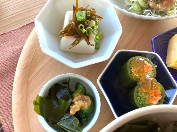 小鉢もわかめの酢味噌和えや冷奴にも茎わかめ。そして昆布の生春巻きは野菜シャキシャキ。