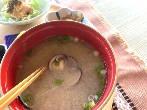 わかめご飯はシャキシャキのわかめがたっぷり。しじみの味噌汁は北上川のべっこうしじみで、クセがなく美味しい!